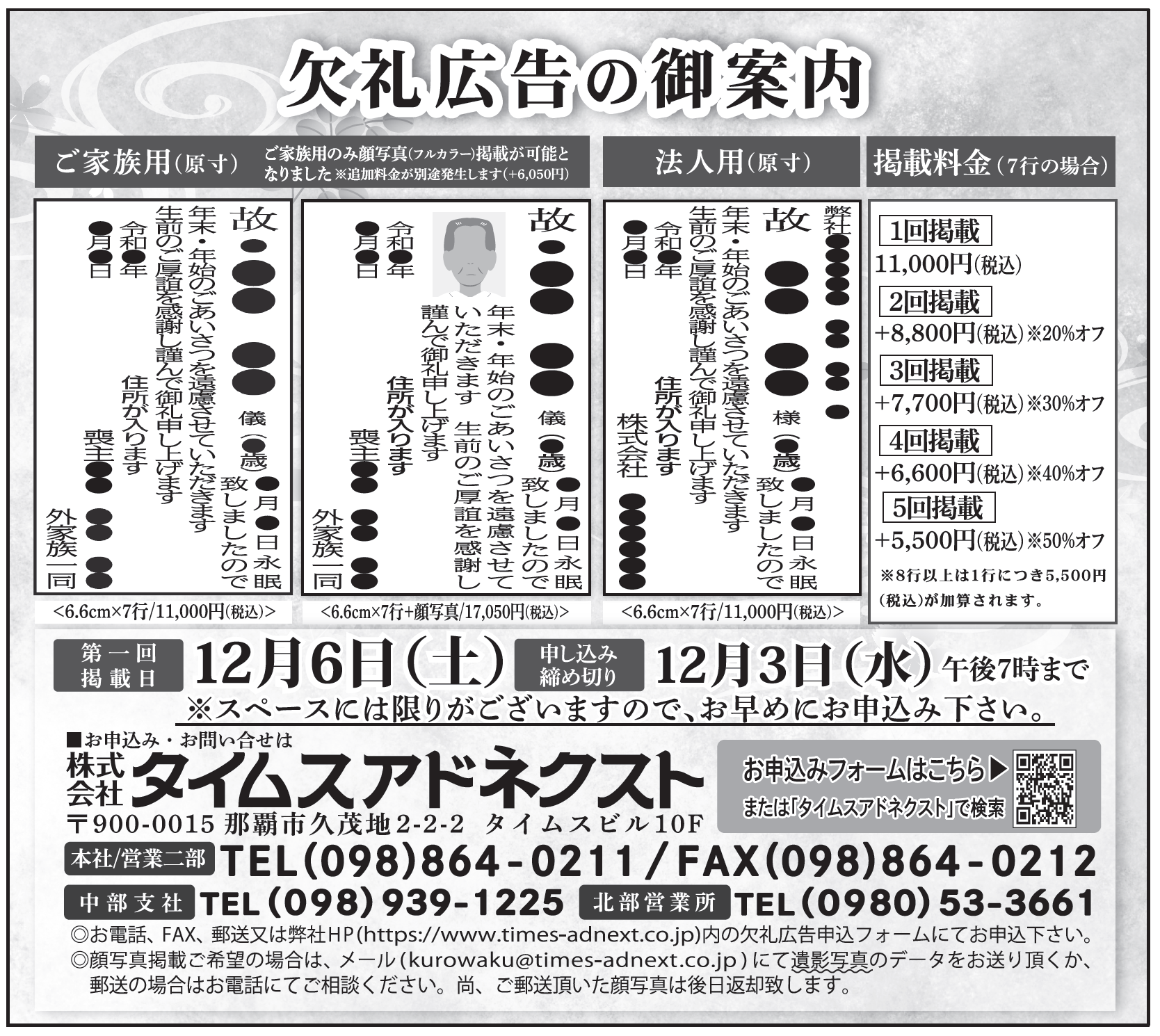 今年もあとわずかで新年を迎えることとなりました。服喪中のご祝辞や年賀状など、欠礼のご挨拶を広く告知できますよう沖縄タイムス朝刊紙面にて欠礼広告を特集を企画致します。連載を希望される場合、最大で5回まで(同一原稿に限る)受付させて頂きます。