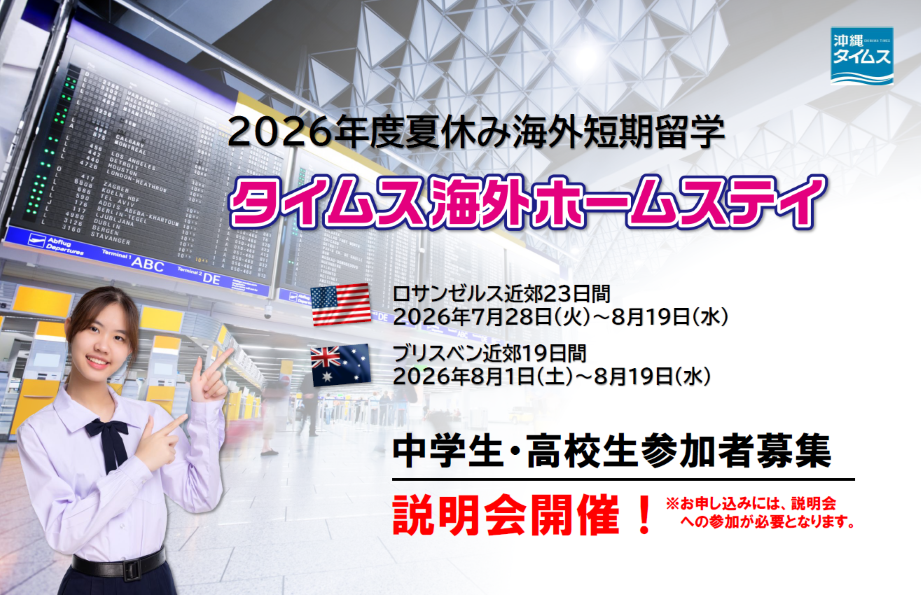 この度、沖縄タイムス社では、日本国際生活体験協会(EIL)及び、リウボウ旅行サービスと共に、県内の中学生・高校生を対象にした2026年度の夏休み短期留学研修『タイムス海外ホームステイ』を実施いたします。